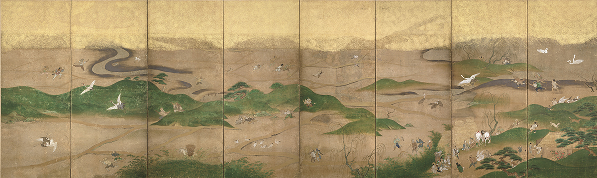 江戸時代前期の絵師・久隅守景(生没年不詳)による鷹狩図の名品。8曲1双の画面に水辺の田園風景が広がり、鷹狩に従事する鷹匠や餌指・犬牽の姿や、白鳥や鶴・雁・鴨・鷺・雉子などを仕留めるオオタカやハイタカの様がいきいきと描かれる。本作の制作時期は不詳だが、守景が加賀前田家の庇護を受け、金沢に逗留した晩年の作である可能性が提示されている。代々、国元で加賀藩の御用をつとめた狩野派絵師・梅田家に本作の模写が伝わったことからも、当地とゆかりが深い作品と考えられる。