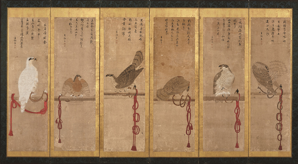 押絵貼屏風の形式をとり、止まり木である架に繋がれた12居の鷹が描かれる。こうした所謂「架鷹図」は室町時代以降に流行し、各扇で描き分けられる鷹の姿態や大緒の複雑な結び方などが見どころである。本作品もオオタカの幼鳥・若鳥・成鳥、ハイタカやハヤブサといった鳥種や成長段階の違いに気を配り、羽の色や生え変わりの様を表現する。上部の賛は元和期(1615~24)に加賀前田家3代・利常の庇護を受けたと考えられる明人・王伯子(字は國鼎)による。もとは加賀前田家2代・利長の菩提寺である高岡・瑞龍寺に伝来し、利常の寄進品として知られてきた。明治初頭に改装されるまでは8曲1双であり、16居の鷹が描かれていたという。