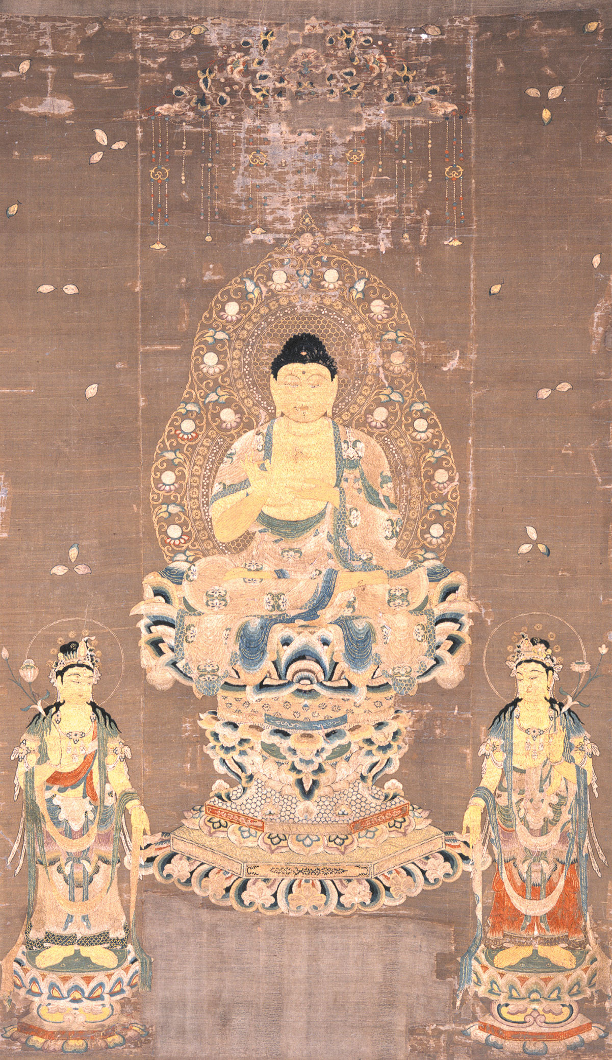 一見すると絵画に見える本作は、阿弥陀三尊像を刺繍で描いた繍仏と呼ばれる作品。華足付の豪華な蓮華座に座し、胸前で印を結ぶ阿弥陀如来と右側に観音菩薩、左側に勢至菩薩を配す。刺し繍を基本としつつも、各所に留め繍や返し繍といった技法も用いており、濃紺・青・緑・黄・赤など多彩な色糸を駆使したグラデーションも美しく、専門の工人の手になるものであろう。本作は従来鎌倉時代の制作とされてきたが、平安時代仏画の趣があること、また平安末期の繍仏作品と技法上の類似点が見られることから、最近では平安時代後期~末期頃に制作されたとする見解もある。