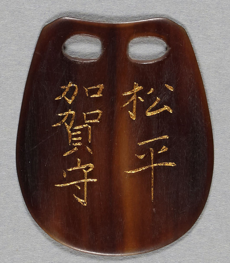鈴板とは、鷹の尾羽の鈴が響きやすくするために付けた板のことである。鷹には、獲物をつかんで草むらなどに入り込んだ時、居場所を特定するために鈴を付けていた。鈴板は、象牙・水牛の角・鯉のエラ蓋で作られることが多く、本資料は水牛の角を加工したものである。「松平加賀守」と筋彫りした後、金で文字を書いている。なお、「松平」は藩主前田家が将軍から与えられた称号で、「加賀守」は受領名である。