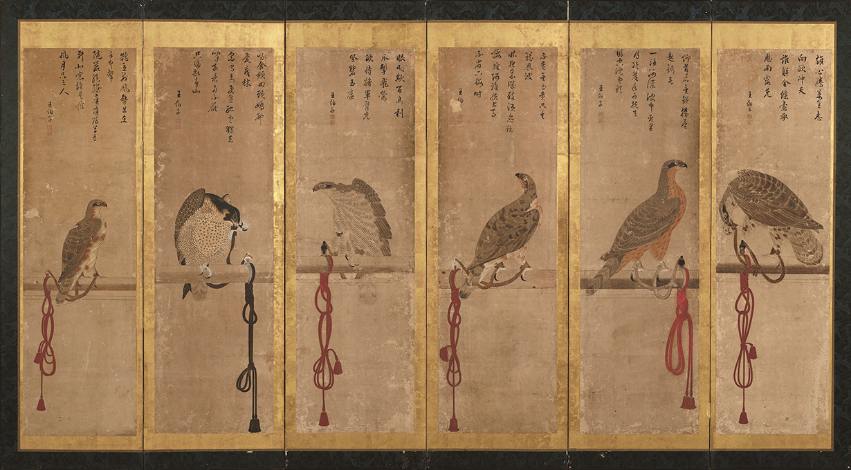 押絵貼屏風の形式をとり、止まり木である架に繋がれた12居の鷹が描かれる。こうした所謂「架鷹図」は室町時代以降に流行し、各扇で描き分けられる鷹の姿態や大緒の複雑な結び方などが見どころである。本作品もオオタカの幼鳥・若鳥・成鳥、ハイタカやハヤブサといった鳥種や成長段階の違いに気を配り、羽の色や生え変わりの様を表現する。上部の賛は元和期(1615~24)に加賀前田家3代・利常の庇護を受けたと考えられる明人・王伯子(字は國鼎)による。もとは加賀前田家2代・利長の菩提寺である高岡・瑞龍寺に伝来し、利常の寄進品として知られてきた。明治初頭に改装されるまでは8曲1双であり、16居の鷹が描かれていたという。