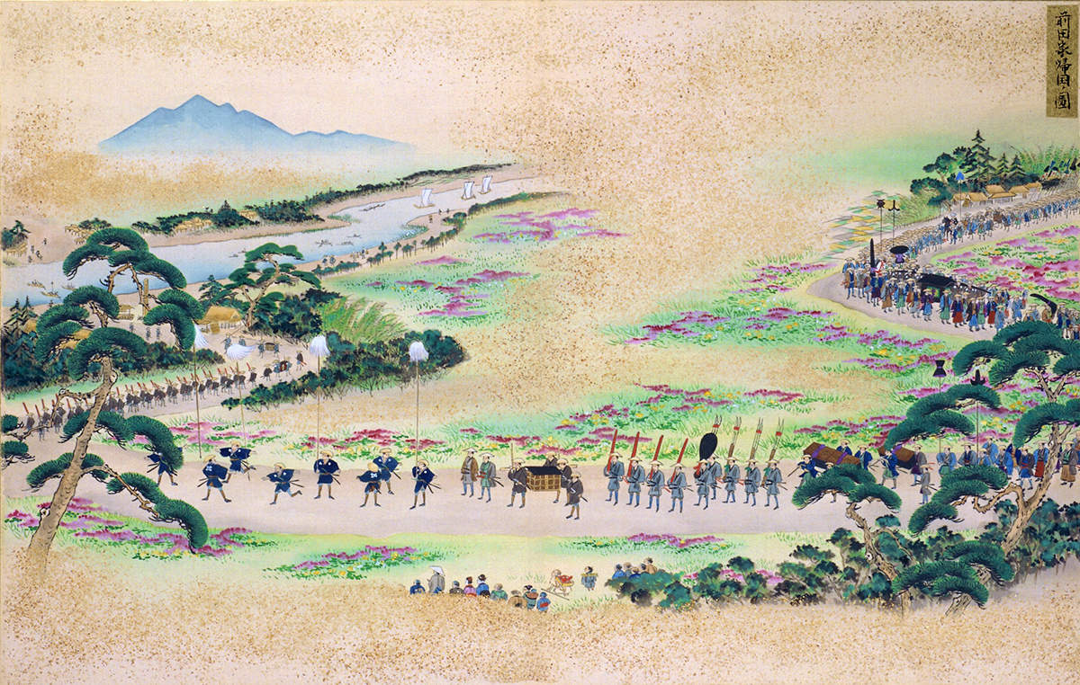 前田家が江戸から金沢へ帰国する時の様子を描いた図。左奥に描かれている大きな川は、戸田川(現在の荒川)であろう。右端の中程には、2居の鷹を据えた鷹匠2人が並んで描かれている。色味からオオタカであると判断できる。前田家は、帰国時に将軍からオオタカを2居拝領することが慣例化していた。ただし、近世中後期の史料から藩主とは一緒に帰国していないことが確認でき、本図のように行列に加わっていたわけではない。作者は不明だが、将軍から「御鷹」を2居拝領していた情報を行列図に反映させたのかもしれない。